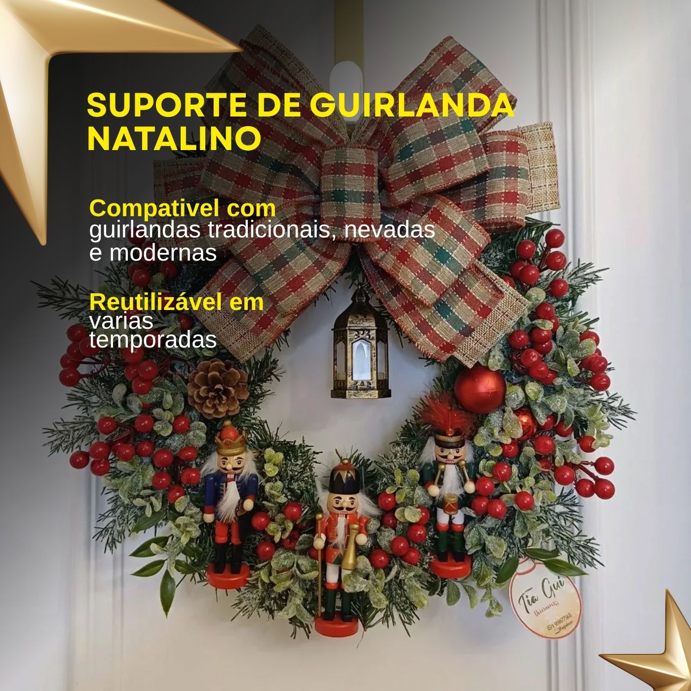 Este produto é um suporte de suspensão projetado para a instalação de guirlandas e ornamentos em portas, dispensando o uso de fixadores permanentes como pregos ou parafusos.